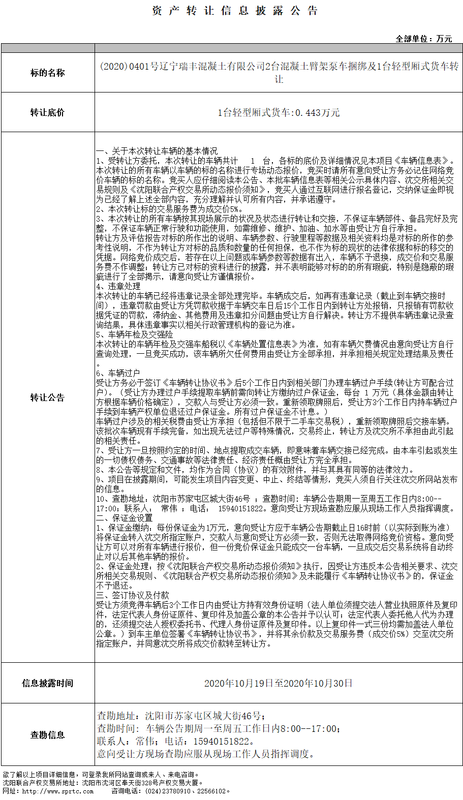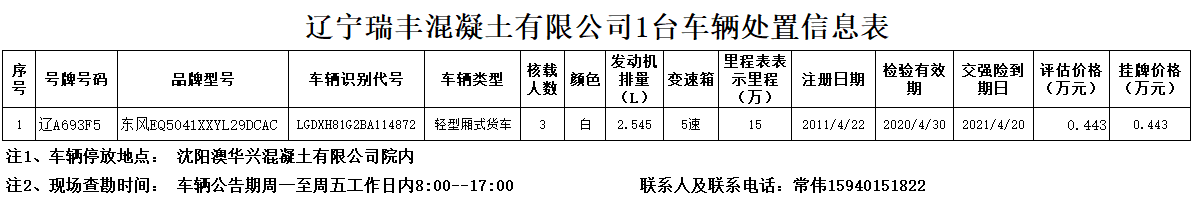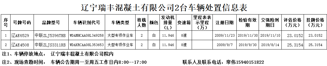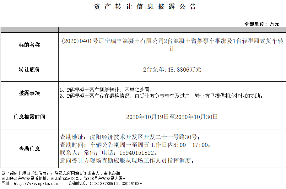 (2020)0401號(hào)遼寧瑞豐混凝土有限公司2臺(tái)混凝土臂架泵車?yán)壖?臺(tái)輕型廂式貨車轉(zhuǎn)讓