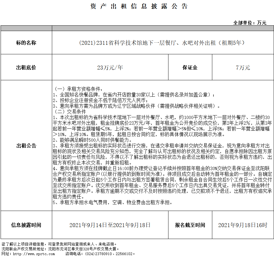 遼寧省科學(xué)技術(shù)館地下一層餐廳、水吧對(duì)外出租(租期5年)