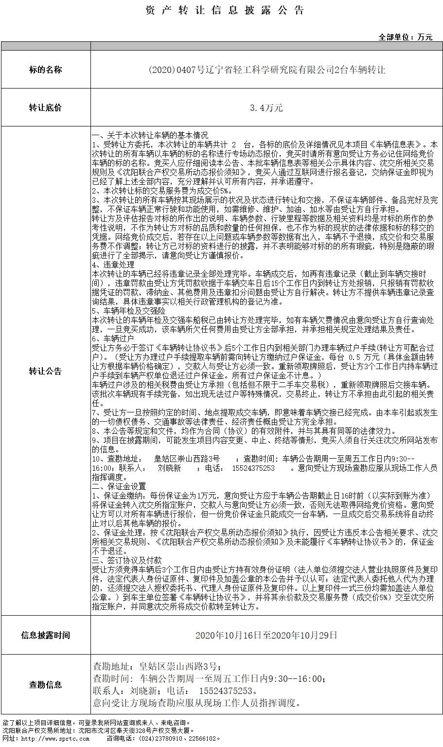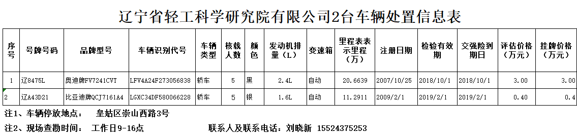 (2020)0407號遼寧省輕工科學研究院有限公司2臺車輛轉讓
