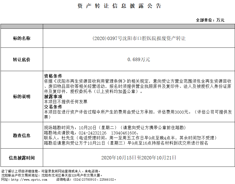沈陽(yáng)市口腔醫(yī)院報(bào)廢資產(chǎn)轉(zhuǎn)讓