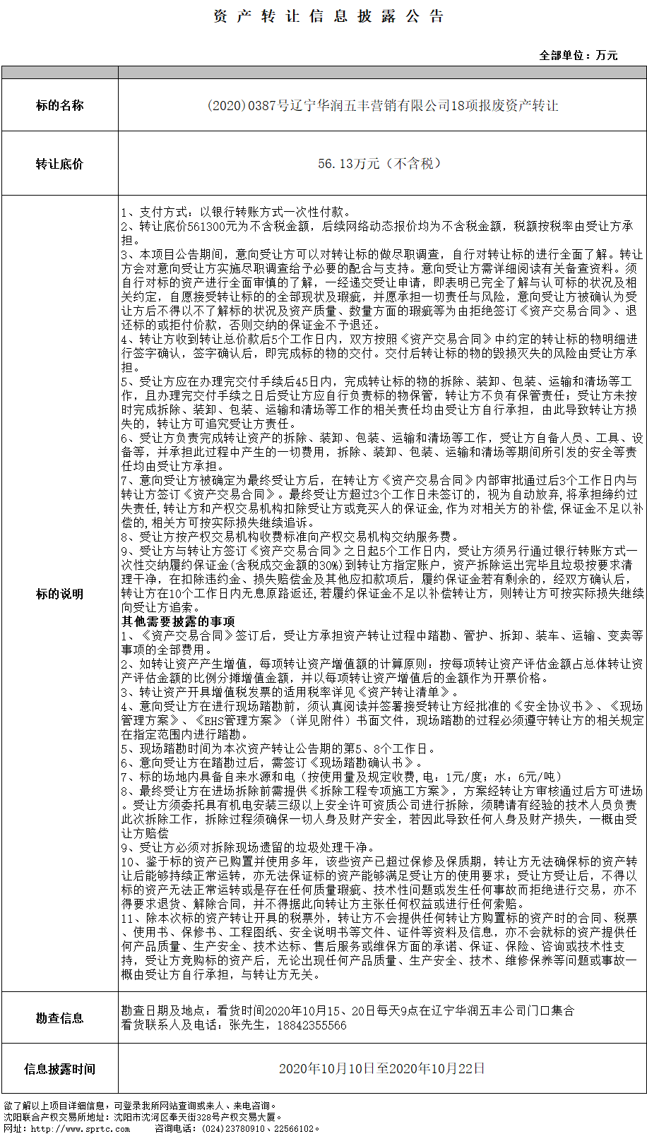 遼寧華潤五豐營銷有限公司18項(xiàng) 報廢資產(chǎn)轉(zhuǎn)讓