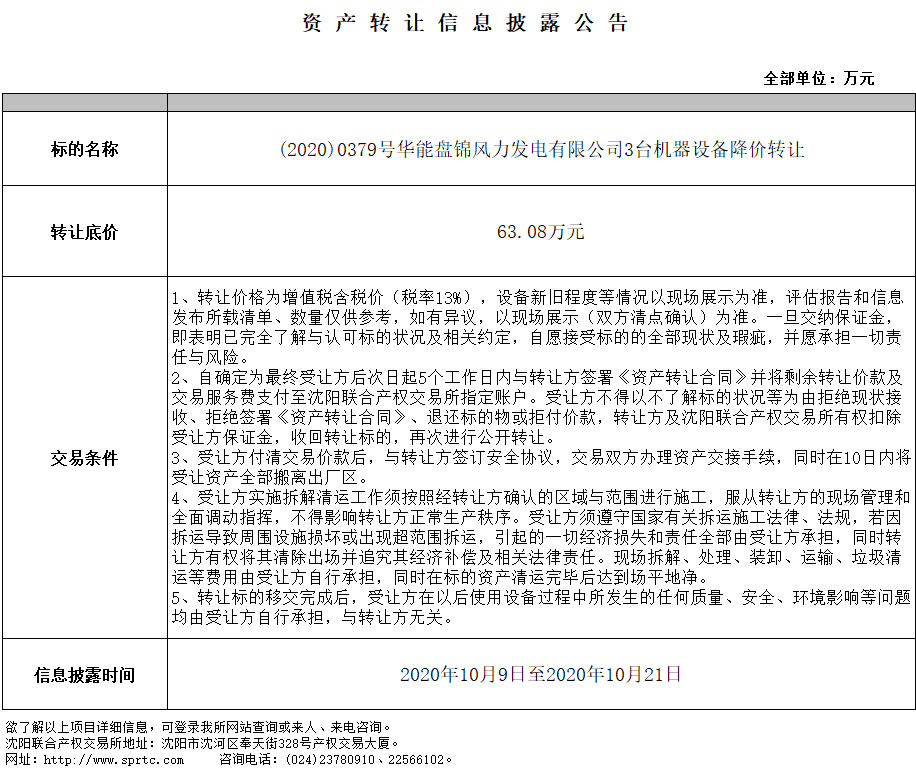 華能盤錦風(fēng)力發(fā)電有限公司 3臺機器設(shè)備轉(zhuǎn)讓