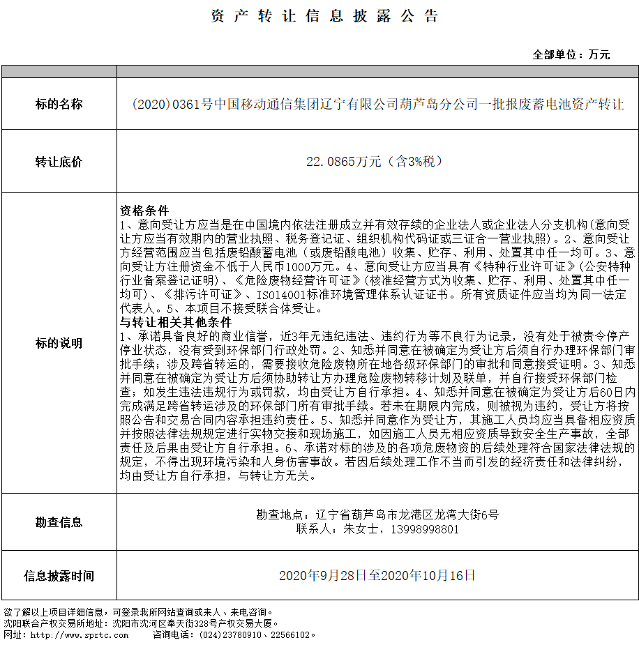 中國移動通信集團遼寧有限公司葫蘆島分公司一批報廢蓄電池資產(chǎn)轉(zhuǎn)讓