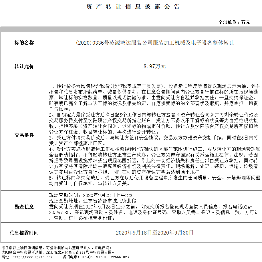 (2020)0336號凌源鴻達服裝公司服裝加工機械及電子設備整體轉讓