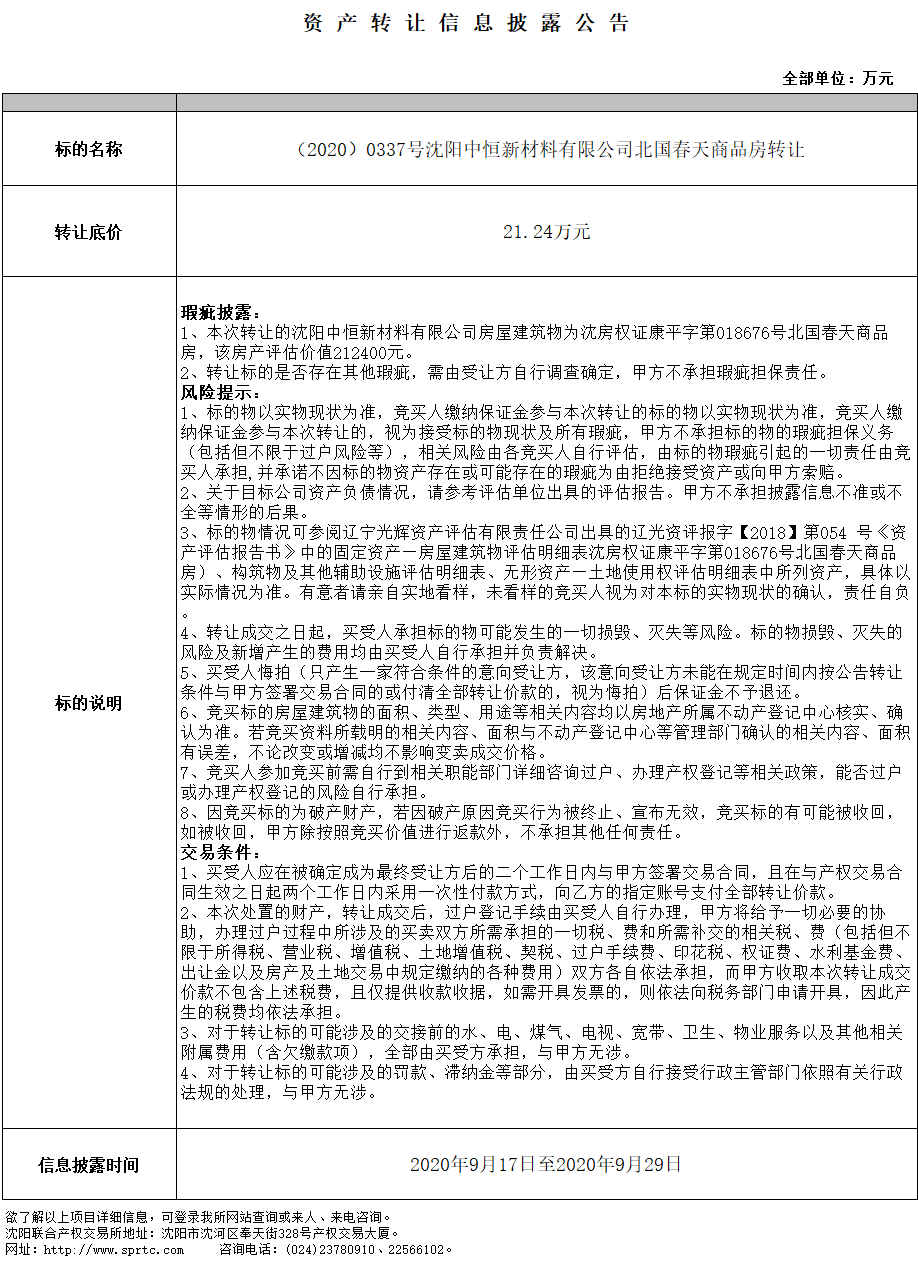 沈陽中恒新材料有限公司北國春天商品房轉(zhuǎn)讓