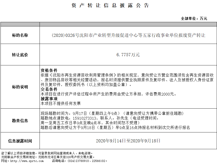 沈陽市產(chǎn)業(yè)轉(zhuǎn)型升級促進中心等五家行政事業(yè)單位報廢資產(chǎn)轉(zhuǎn)讓