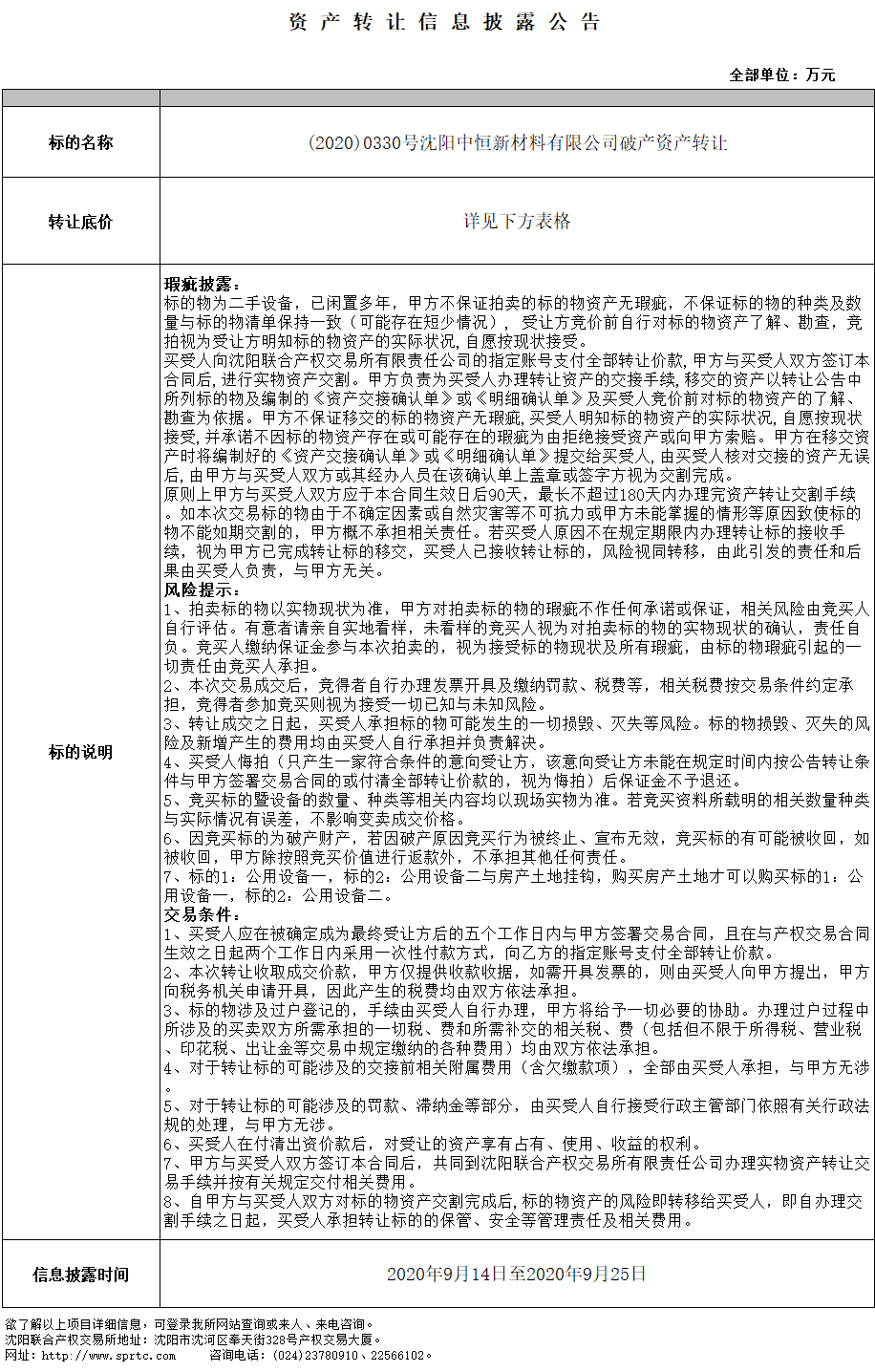 沈陽(yáng)中恒新材料有限公司公用設(shè)備二 第五次掛牌