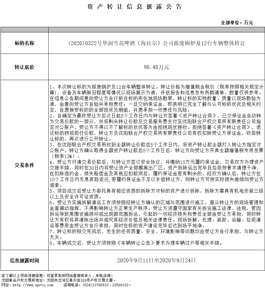 華潤雪花啤酒(海拉爾)公司報廢鍋爐及12臺車輛整體轉讓