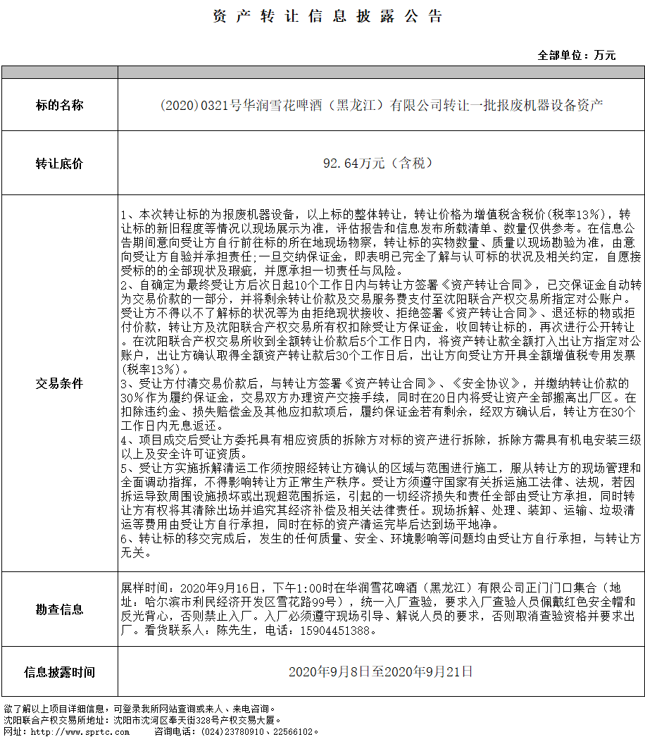 華潤雪花啤酒(黑龍江)有限公司轉(zhuǎn)讓一批報廢機器設(shè)備