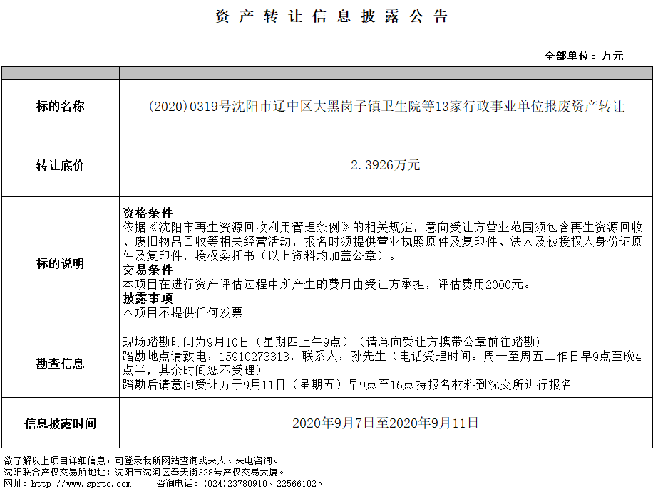 沈陽市遼中區(qū)大黑崗子鎮(zhèn)衛(wèi)生院等13家行政事業(yè)單位報廢資產(chǎn)轉(zhuǎn)讓