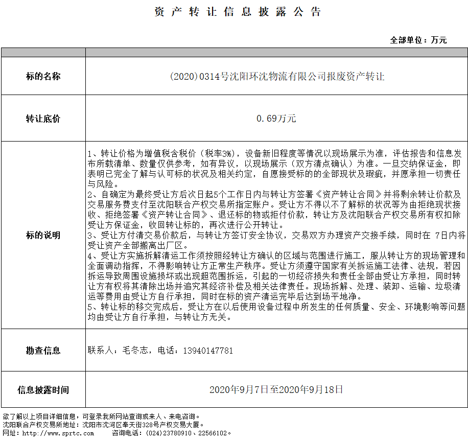 沈陽環(huán)沈物流有限公司報廢資產轉讓
