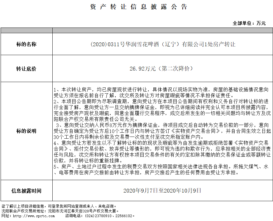 華潤雪花啤酒(遼寧)有限公司轉讓沈陽市和平區(qū)安圖北街2號(7-5-1)房產