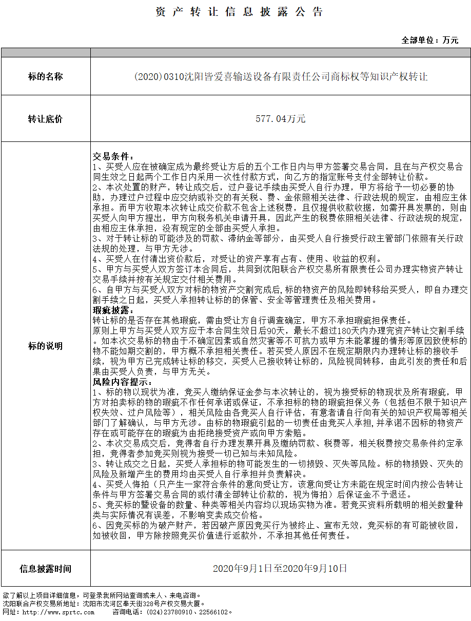 沈陽皆愛喜輸送設(shè)備有限責(zé)任公司商標權(quán)等知識產(chǎn)權(quán)轉(zhuǎn)讓