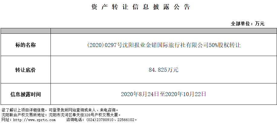 沈陽報業(yè)金锘國際旅行社有限公司50%股權(quán)轉(zhuǎn)讓
