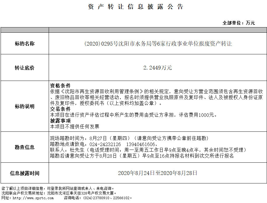 沈陽(yáng)市水務(wù)局等6家行政事業(yè)單位報(bào)廢資產(chǎn)轉(zhuǎn)讓