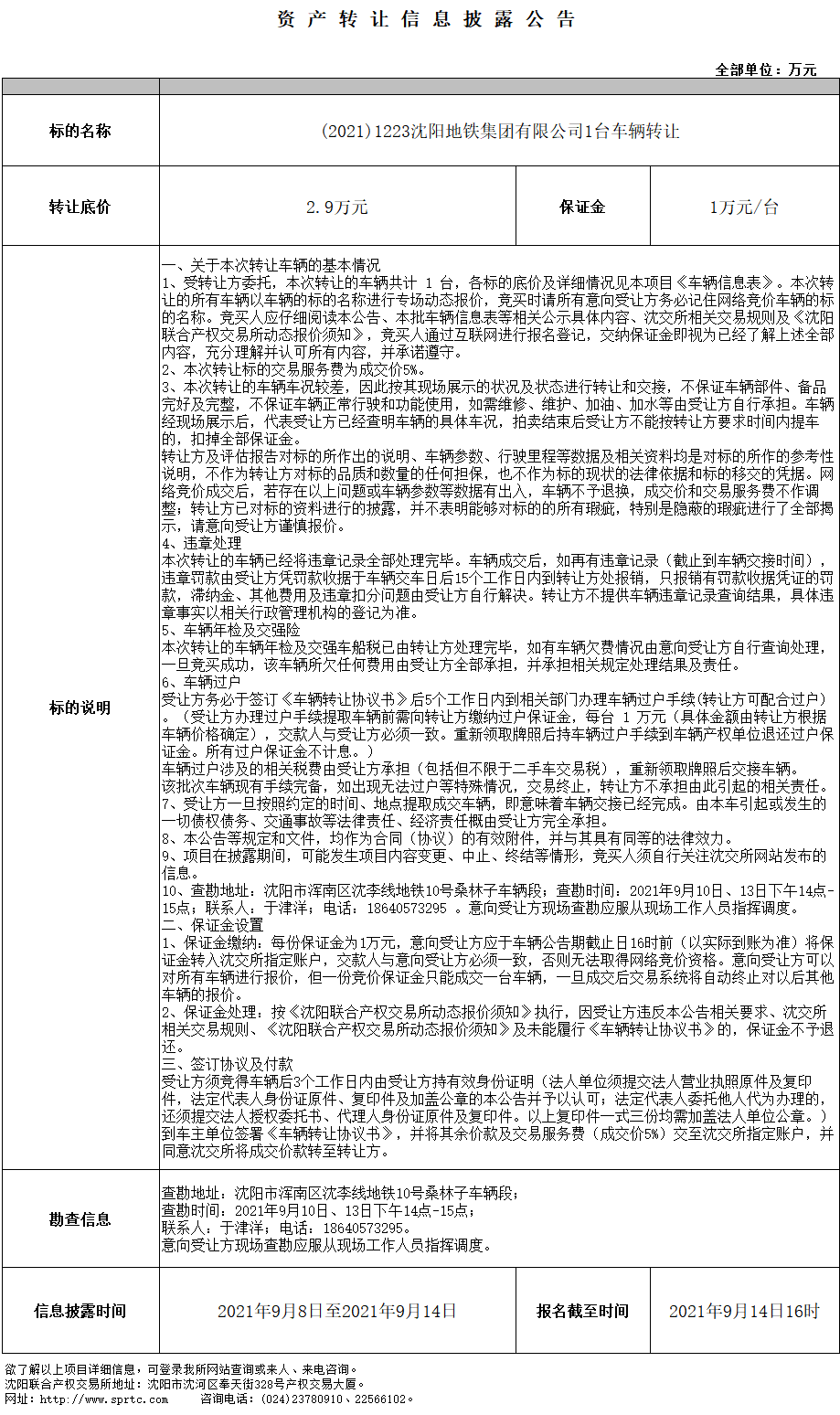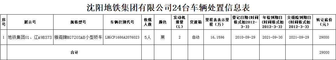 沈陽地鐵集團(tuán)有限公司1臺(tái)車輛轉(zhuǎn)讓