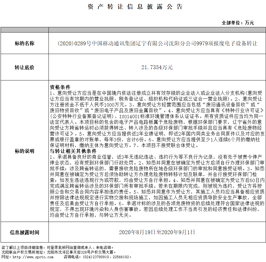 中國(guó)移動(dòng)通訊集團(tuán)遼寧有限公司沈陽(yáng)分公司9979項(xiàng)報(bào)廢電子設(shè)備轉(zhuǎn)讓