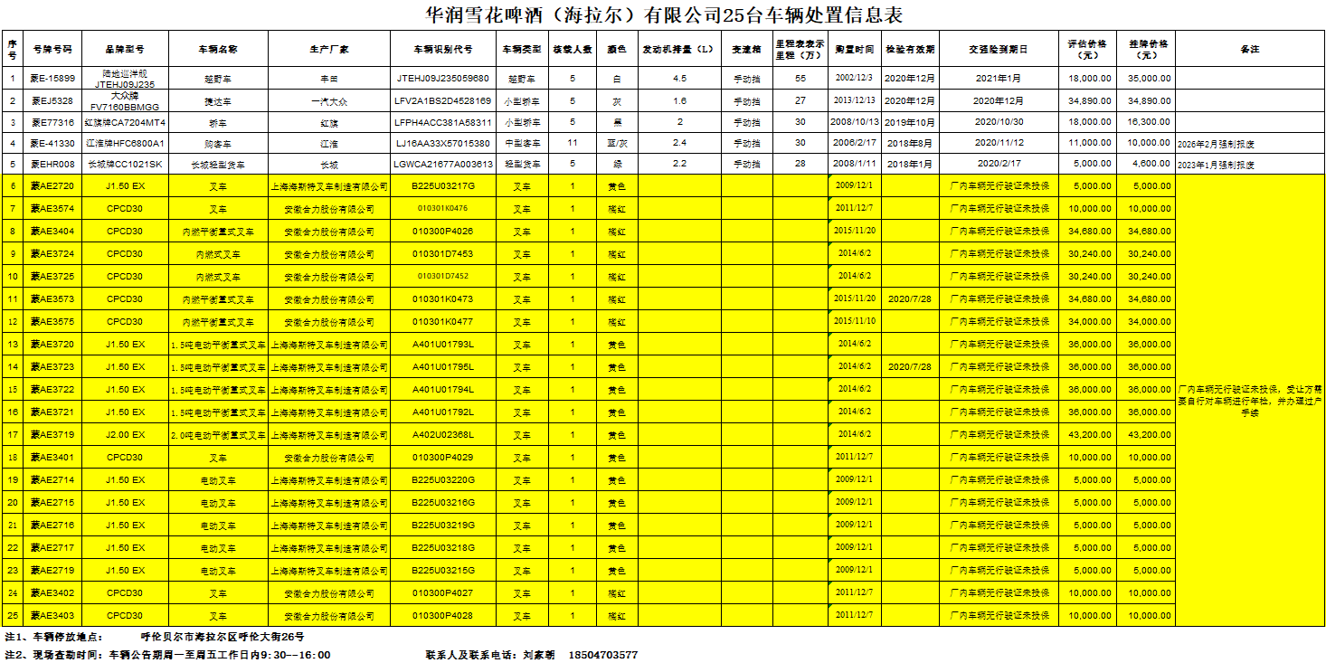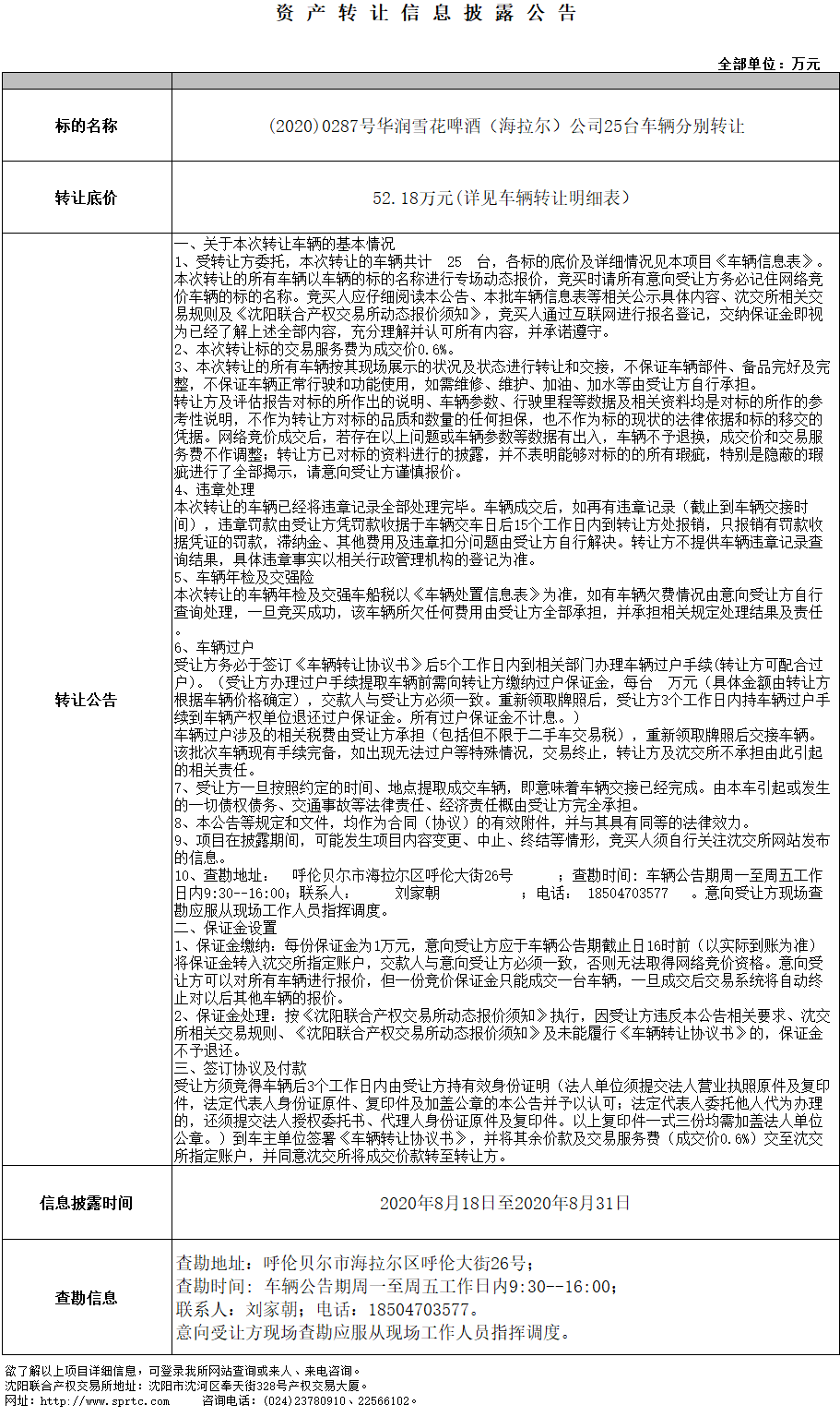 (2020)0287號(hào)華潤(rùn)雪花啤酒(海拉爾)公司25臺(tái)車輛分別轉(zhuǎn)讓