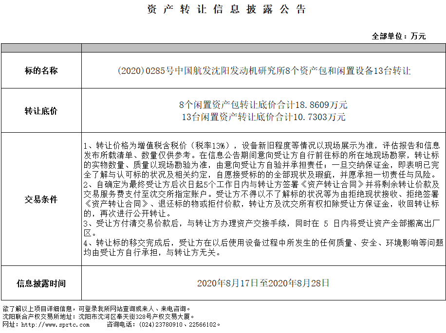 (2020)0285號中國航發(fā)沈陽發(fā)動機研究所8個資產包和閑置設備13臺轉讓
