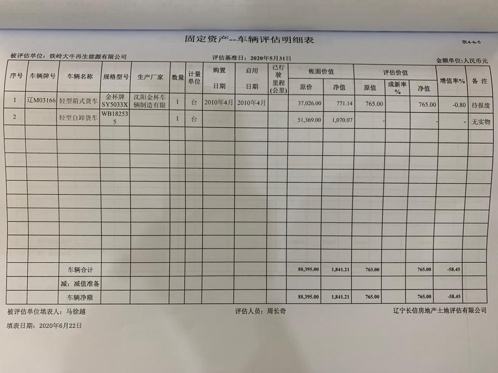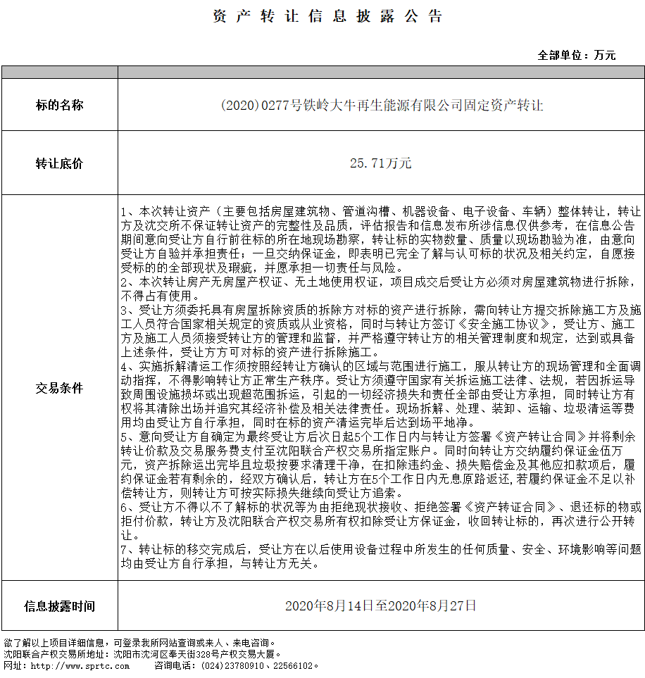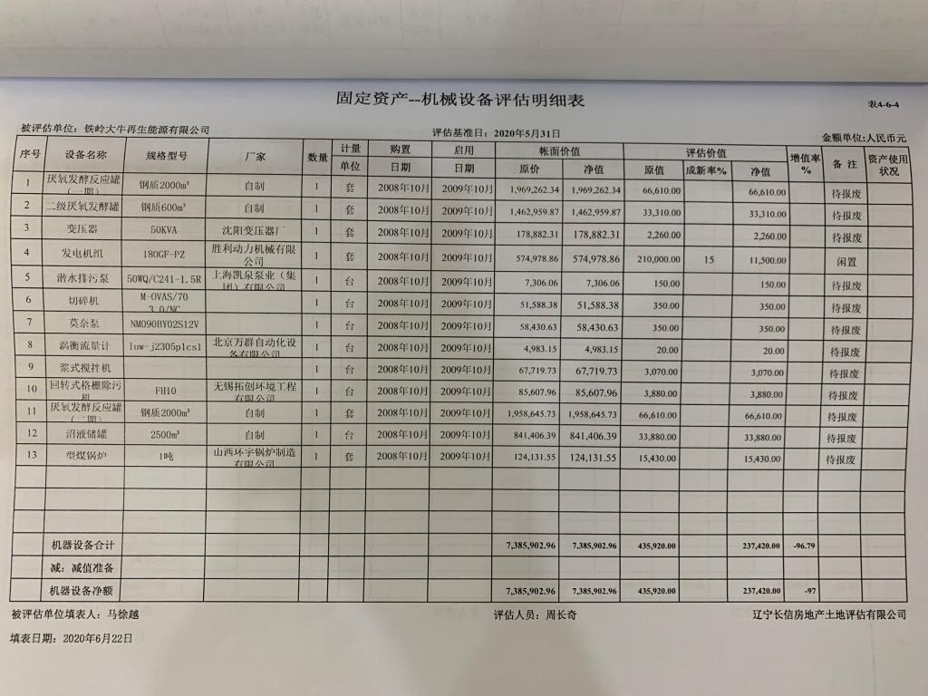 鐵嶺大牛再生能源有限公司固定資產(chǎn)轉(zhuǎn)讓