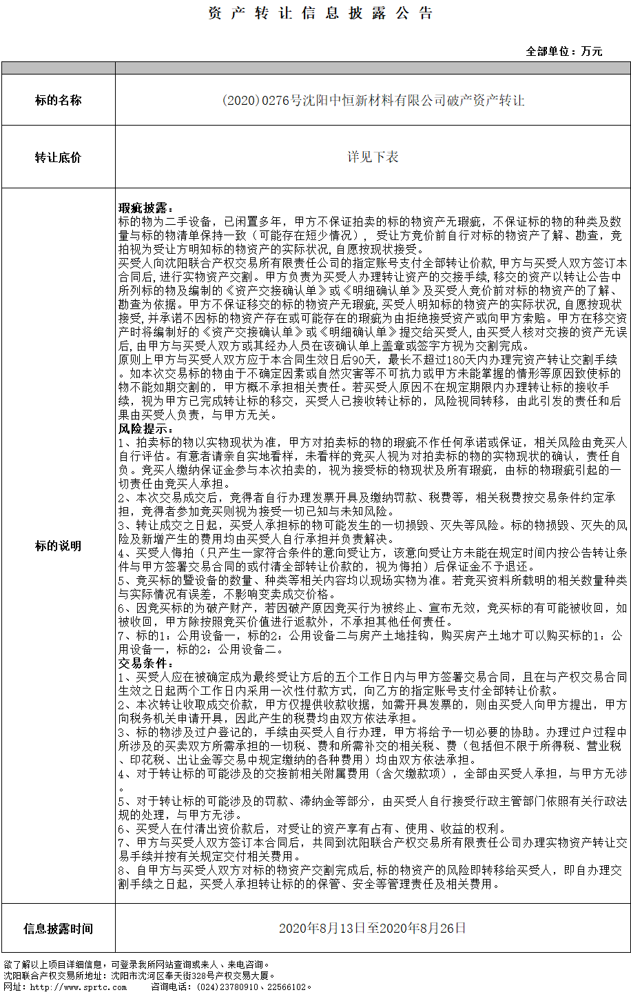 沈陽(yáng)中恒新材料有限公司二手設(shè)備包 公用設(shè)備一 三次掛牌