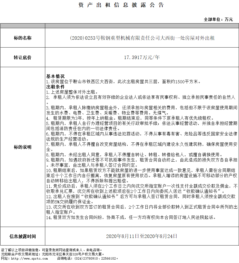 鞍鋼重型機(jī)械有限責(zé)任公司大西街一處房屋對(duì)外出租