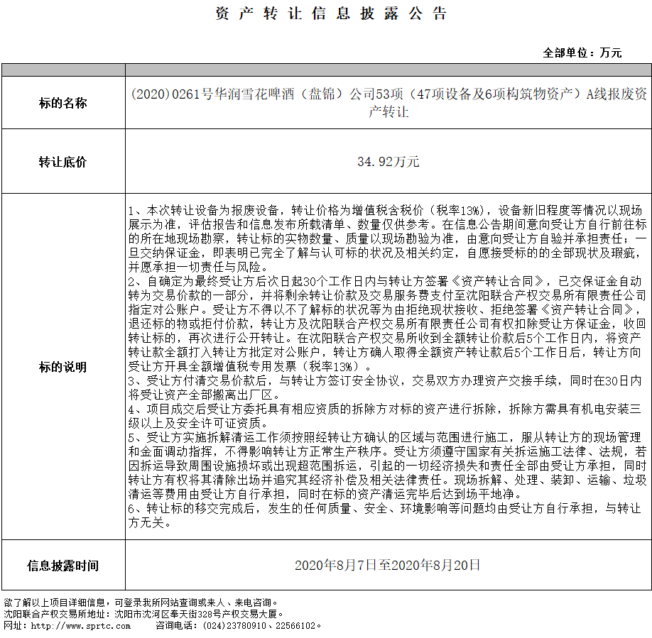 華潤雪花啤酒(盤錦)公司53項(47項設(shè)備及6項構(gòu)筑物資產(chǎn))A線報廢資產(chǎn)轉(zhuǎn)讓