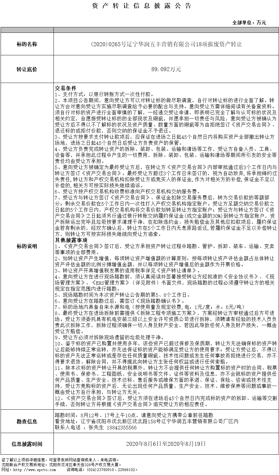 遼寧華潤五豐營銷有限公司18項報廢資產(chǎn)轉讓
