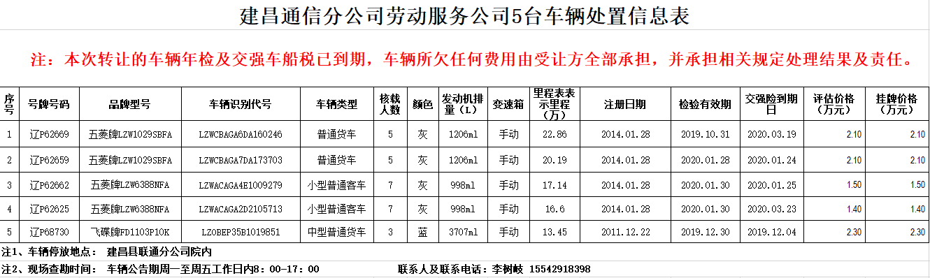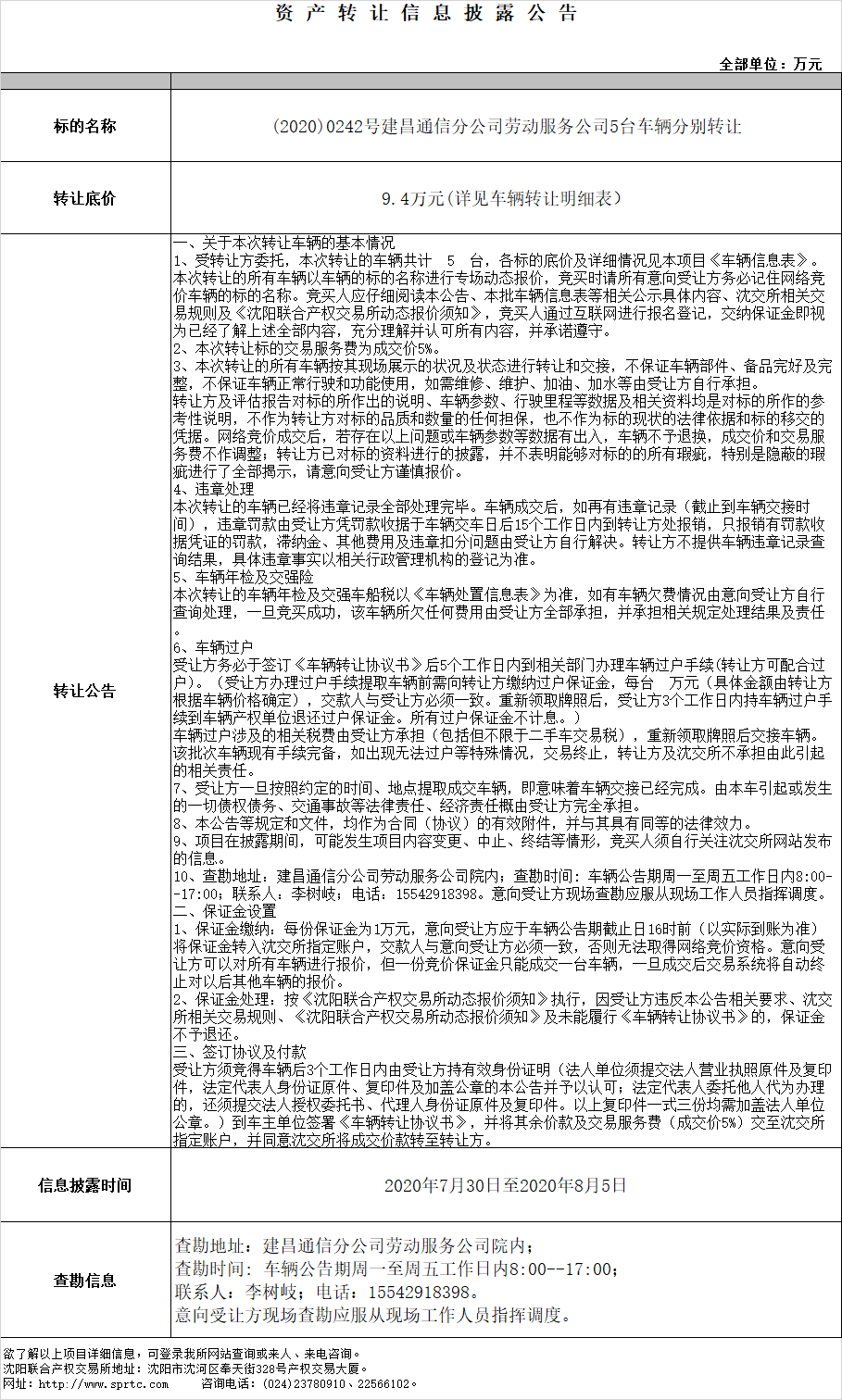 (2020)0242號建昌通信分公司勞動服務公司5臺車輛分別轉讓