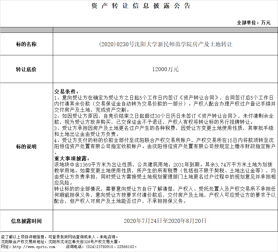 沈陽大學(xué) 新民師范學(xué)院房產(chǎn)及土地轉(zhuǎn)讓