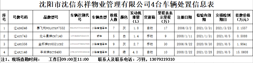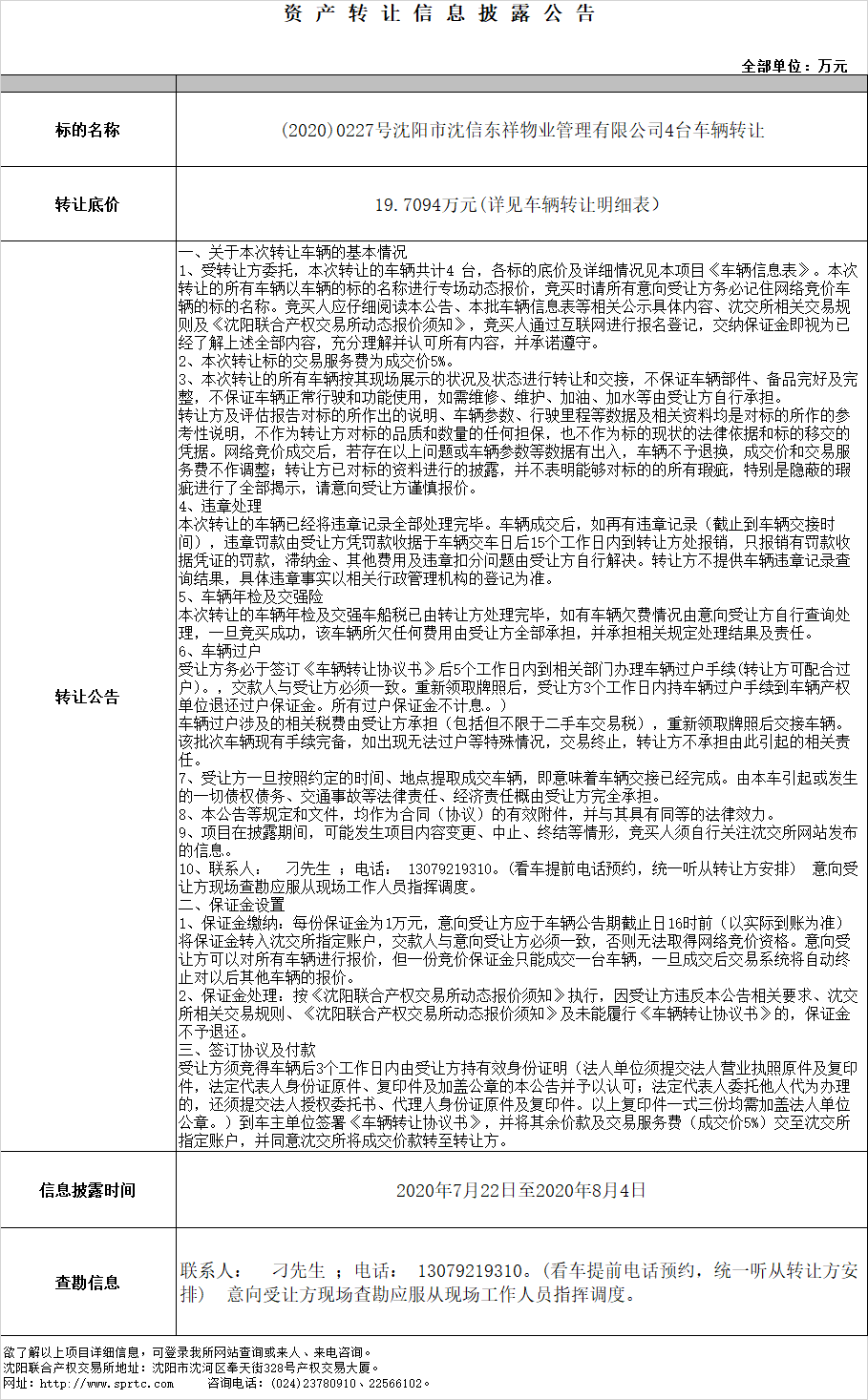 (2020)0227號沈陽市沈信東祥物業(yè)管理有限公司4臺車輛轉(zhuǎn)讓