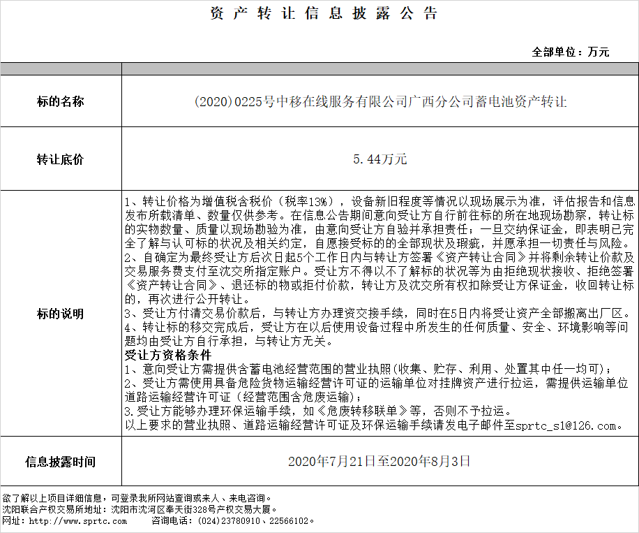 中移在線服務(wù)有限公司廣西分公司蓄電池資產(chǎn)轉(zhuǎn)讓