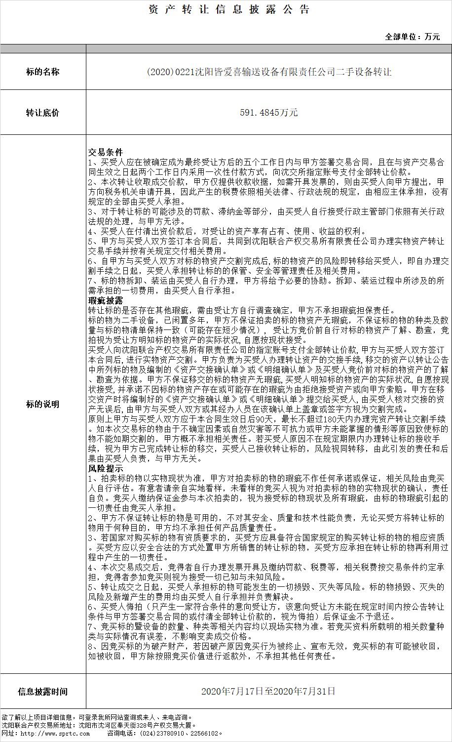 沈陽皆愛喜輸送設(shè)備有限責(zé)任公司二手設(shè)備轉(zhuǎn)讓