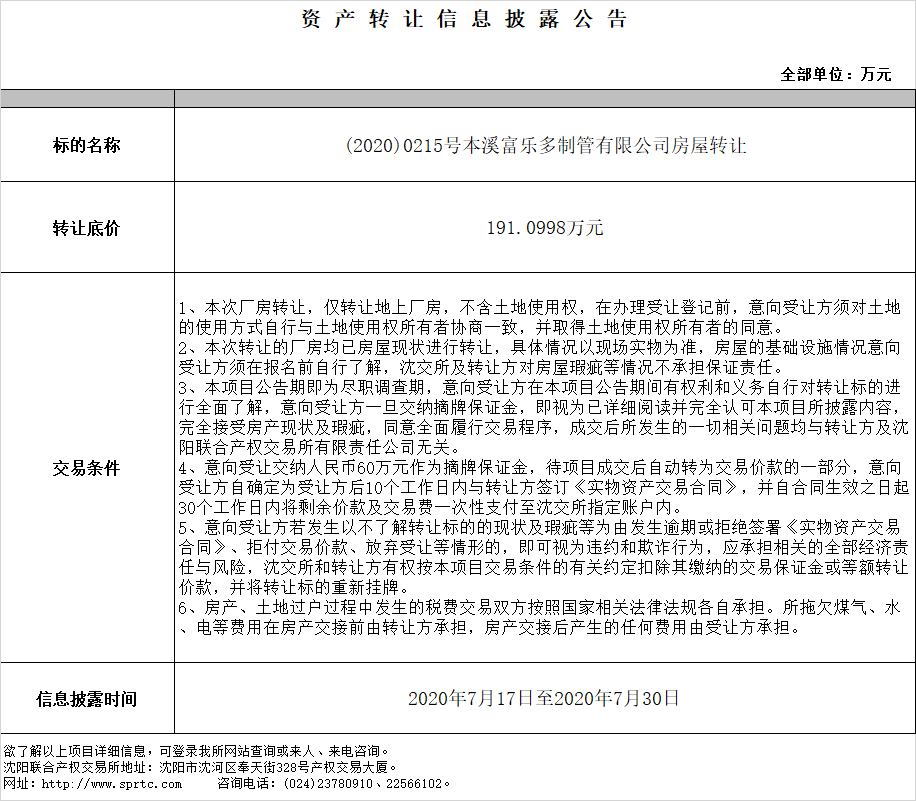 本溪富樂多制管有限公司房屋轉(zhuǎn)讓