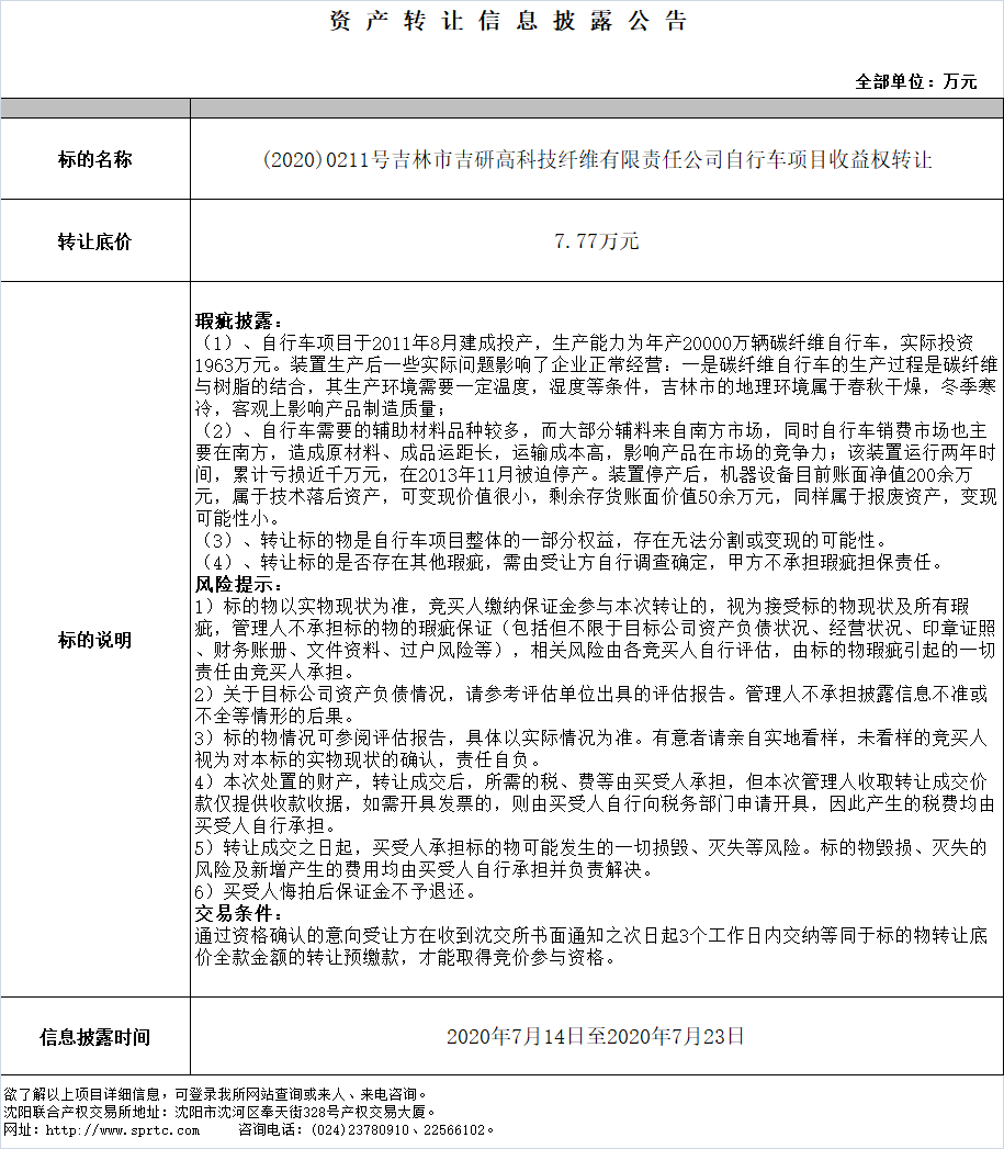 吉研高科技纖維有限責(zé)任公司23.34% 自行車項目收益權(quán)轉(zhuǎn)讓