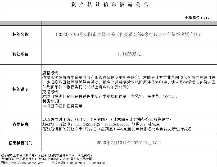 沈陽市直屬機(jī)關(guān)工作委員會等5家行政事業(yè)單位報廢資產(chǎn)轉(zhuǎn)讓