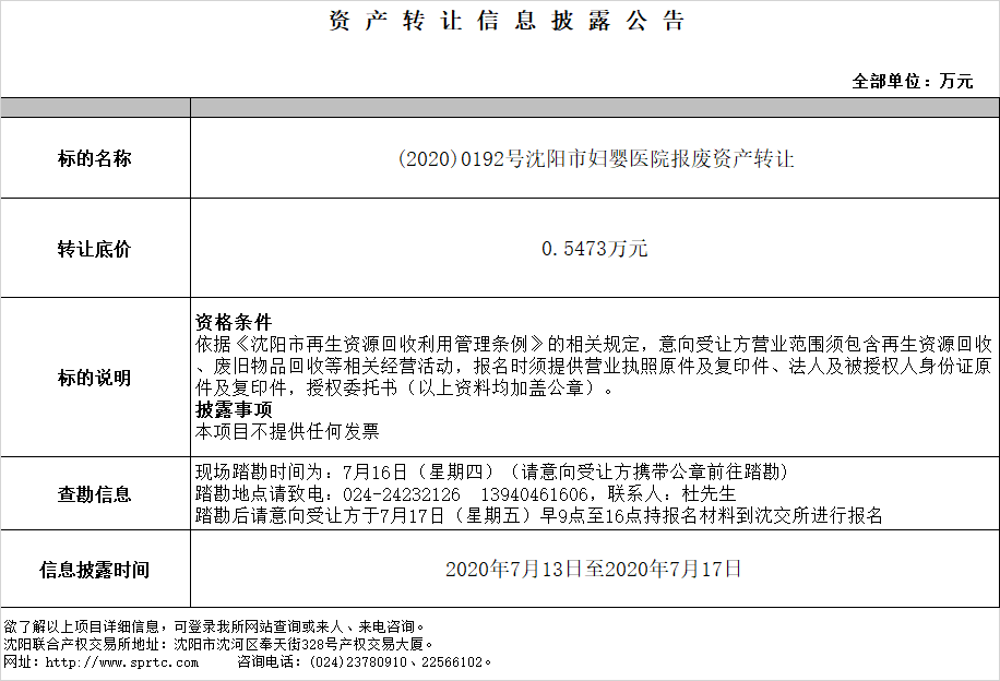 沈陽(yáng)市婦嬰醫(yī)院報(bào)廢資產(chǎn)轉(zhuǎn)讓