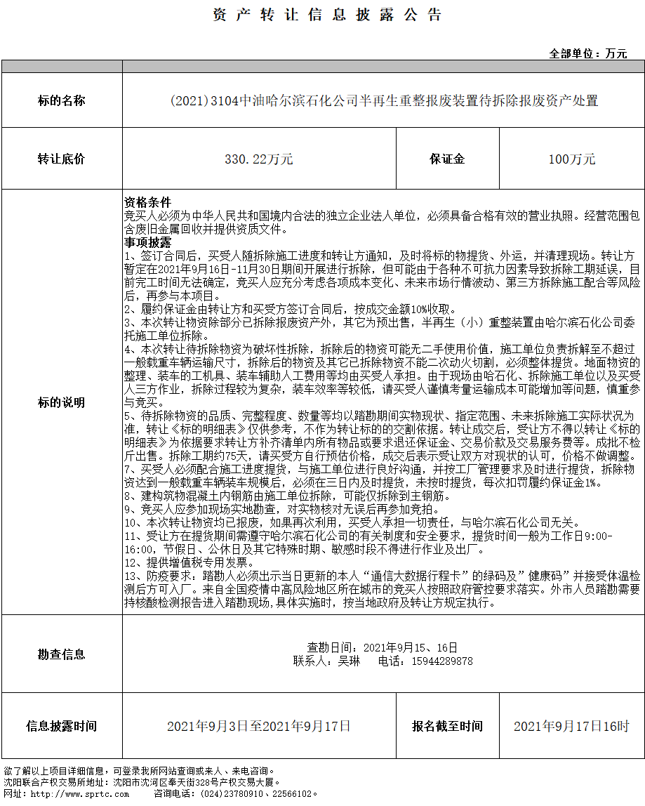 中油哈爾濱石化分公司半再生重整報廢裝置待拆除報廢資產處置