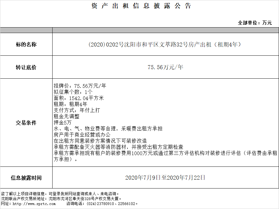 沈陽市和平區(qū)文萃路32號房產(chǎn)出租 (租期4年)。