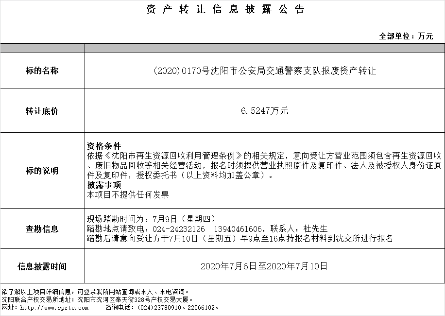 (2020)0170號沈陽市公安局交通警察支隊報廢資產轉讓