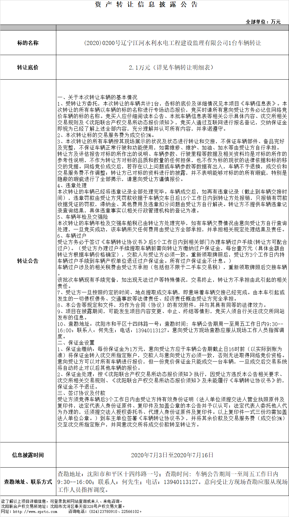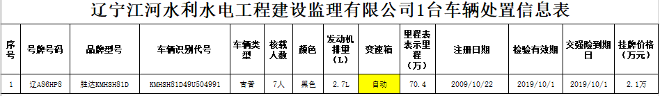 (2020)0200號遼寧江河水利水電工程建設(shè)監(jiān)理有限公司1臺車輛轉(zhuǎn)讓