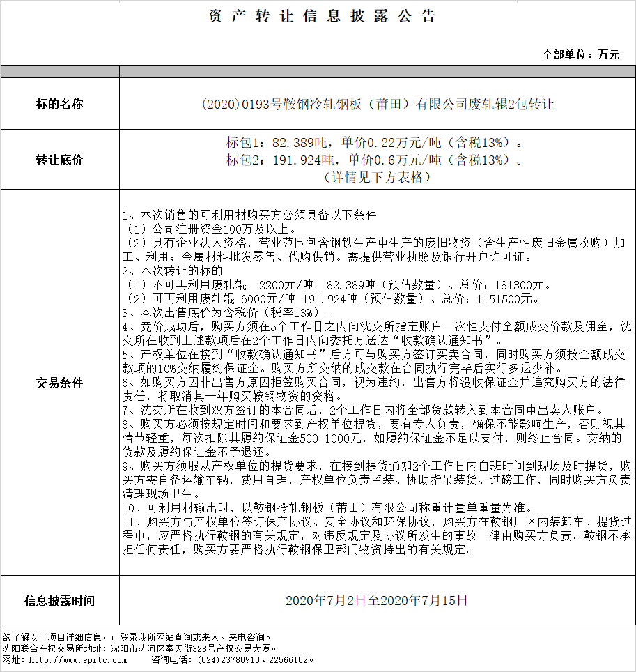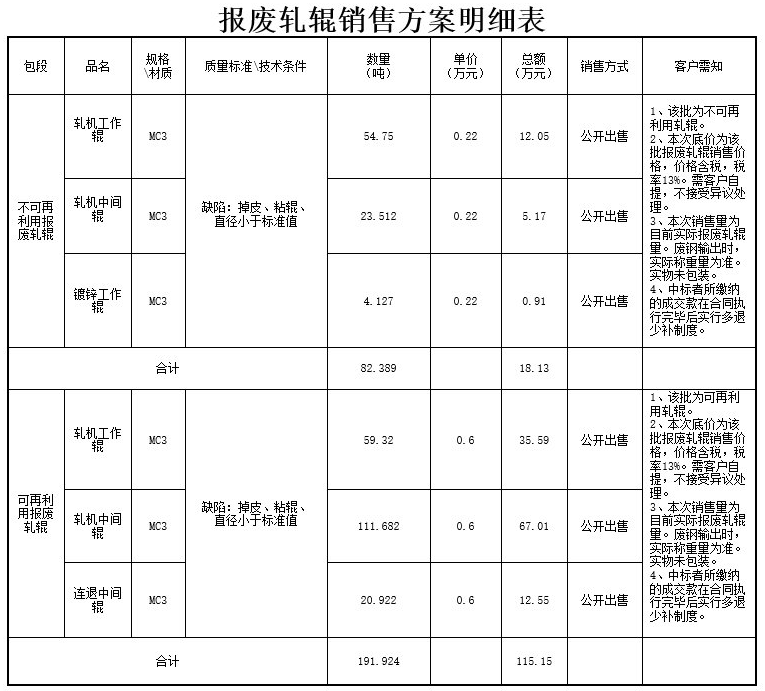 鞍鋼冷軋鋼板(莆田)有限公司不可再利用報廢軋輥