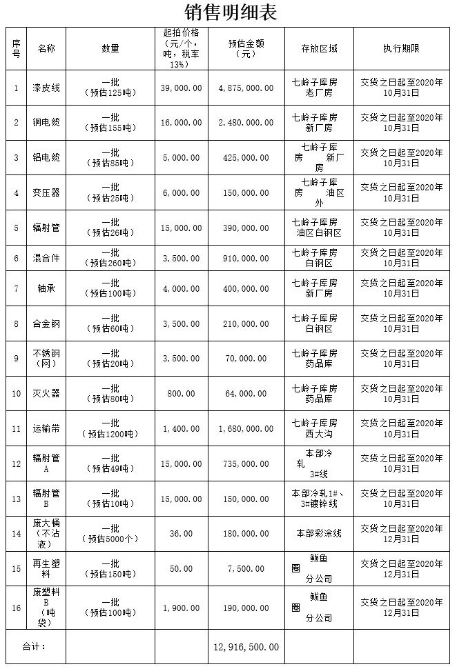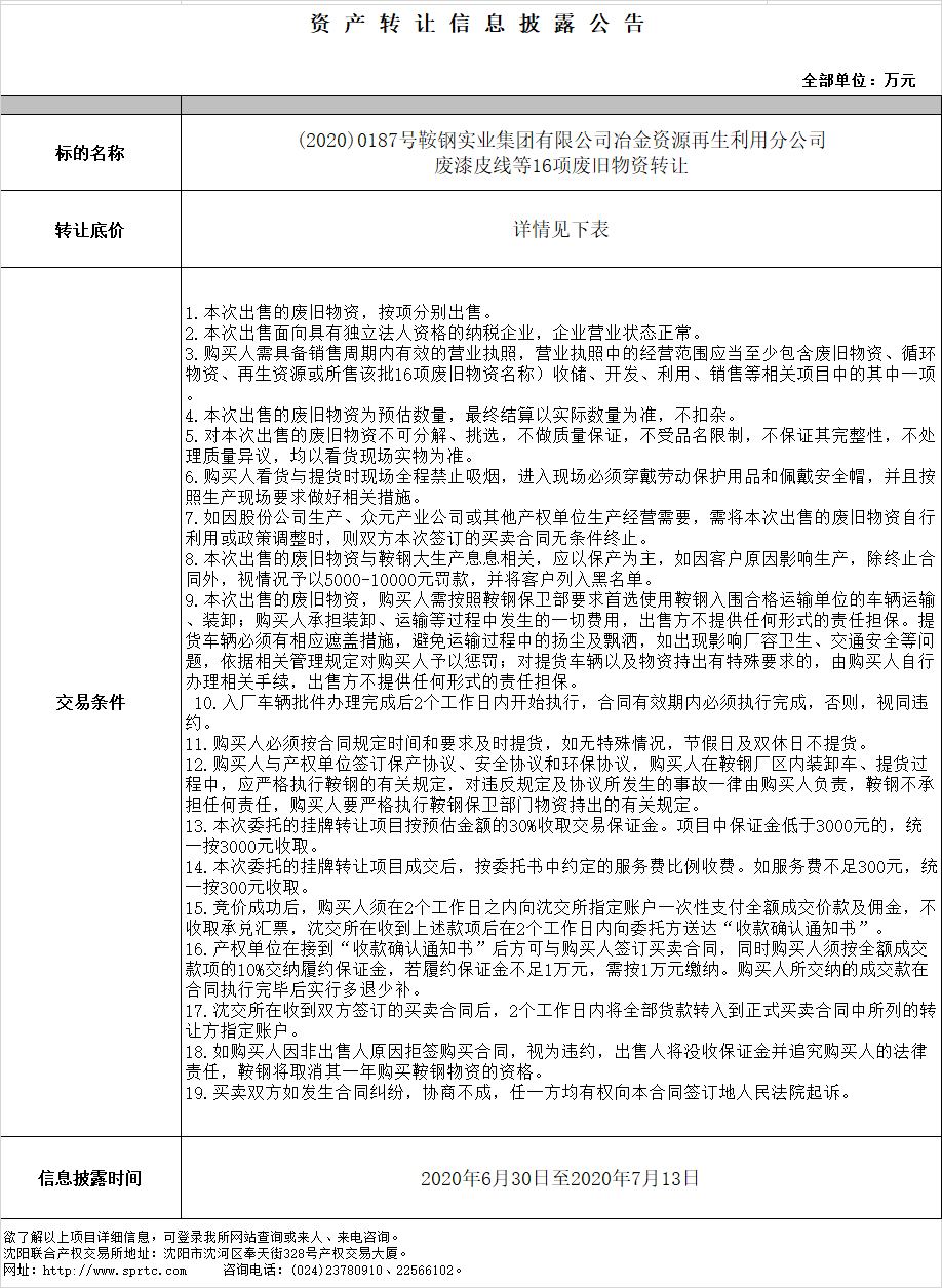 (2020)0187號鞍鋼實業(yè)集團有限公司冶金資源再生利用分公司廢漆皮線等16項廢舊物資轉(zhuǎn)讓
