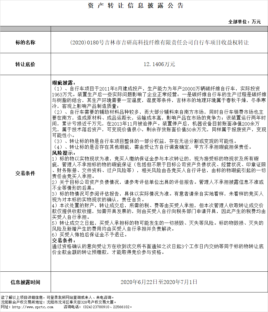 吉研高科技纖維有限責(zé)任公司23.34% 自行車項(xiàng)目收益權(quán)轉(zhuǎn)讓
