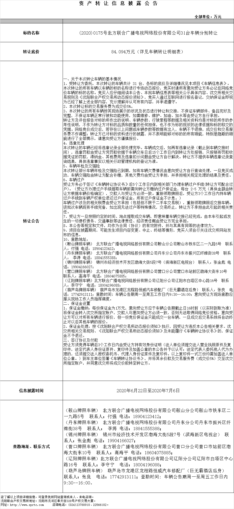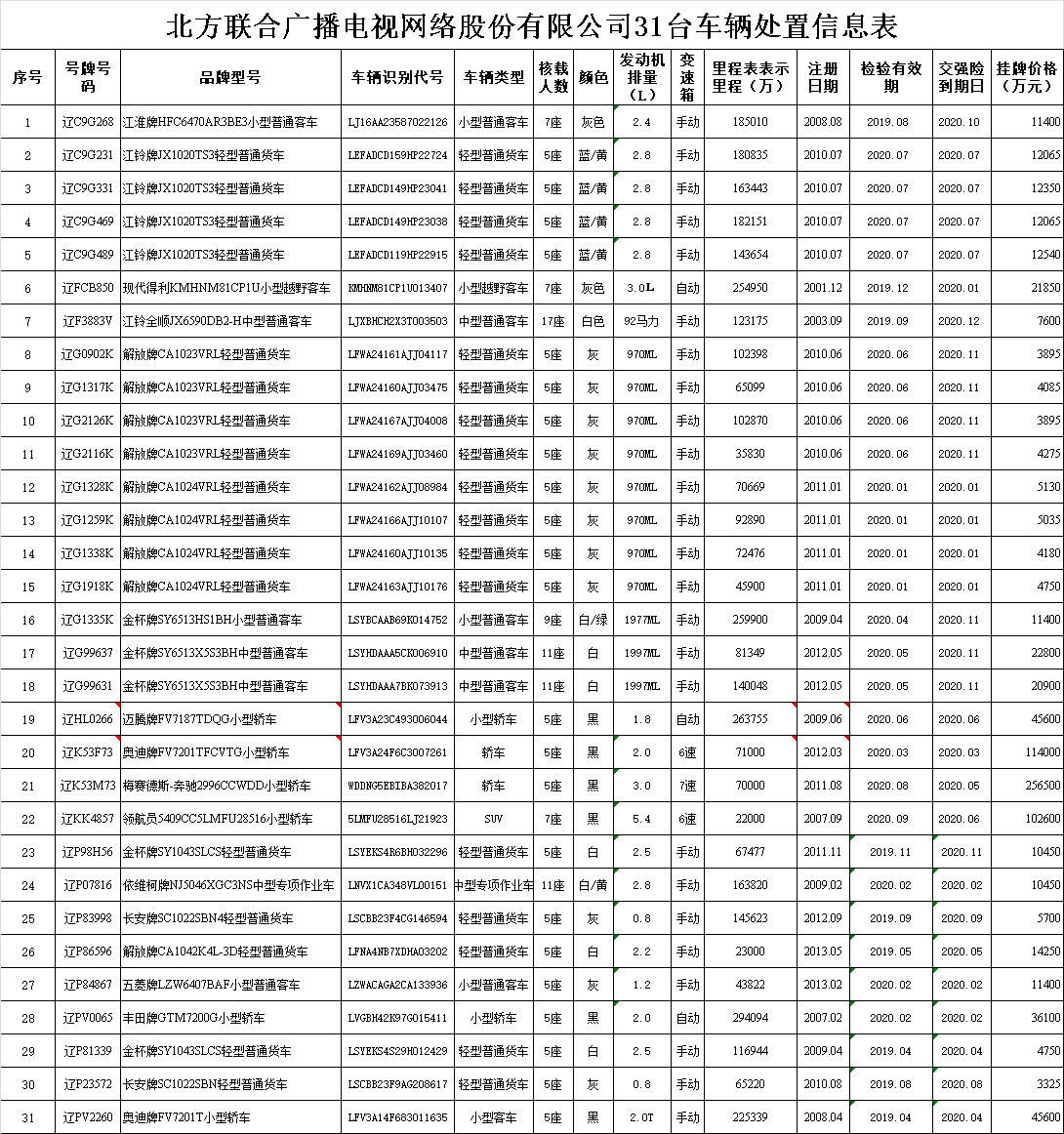 (2020)0175號北方聯(lián)合廣播電視網(wǎng)絡(luò)股份有限公司31臺車輛分別轉(zhuǎn)讓