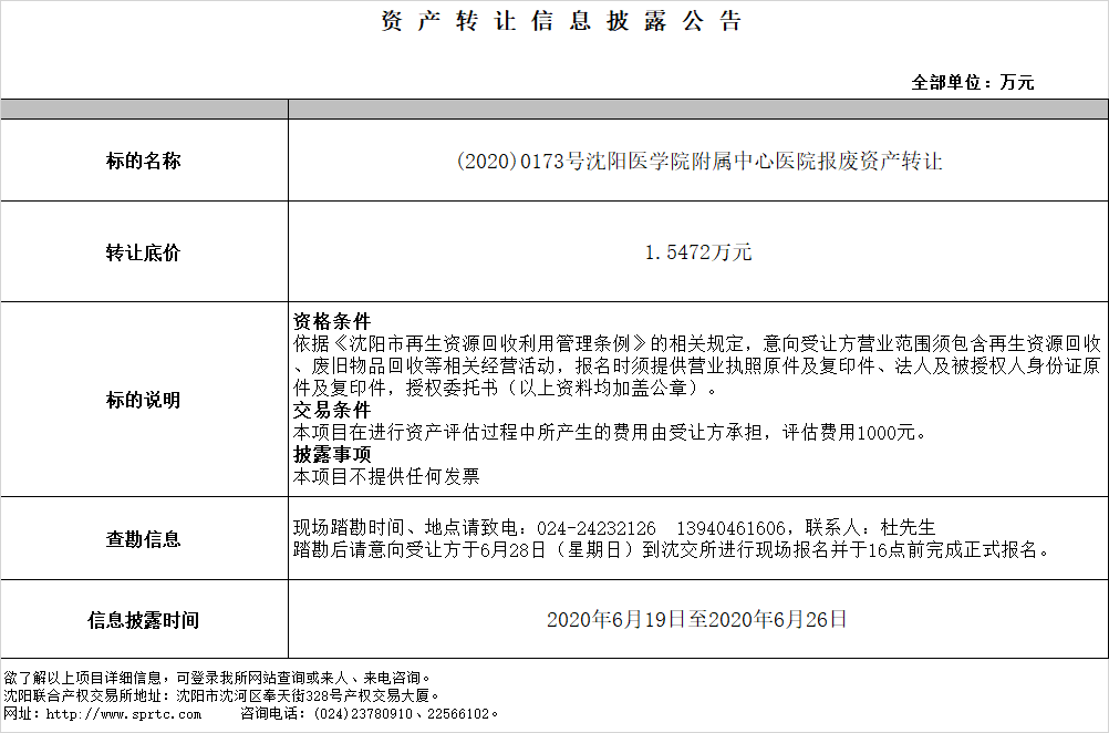 (2020)0173號沈陽醫(yī)學(xué)院附屬中心醫(yī)院報廢資產(chǎn)轉(zhuǎn)讓