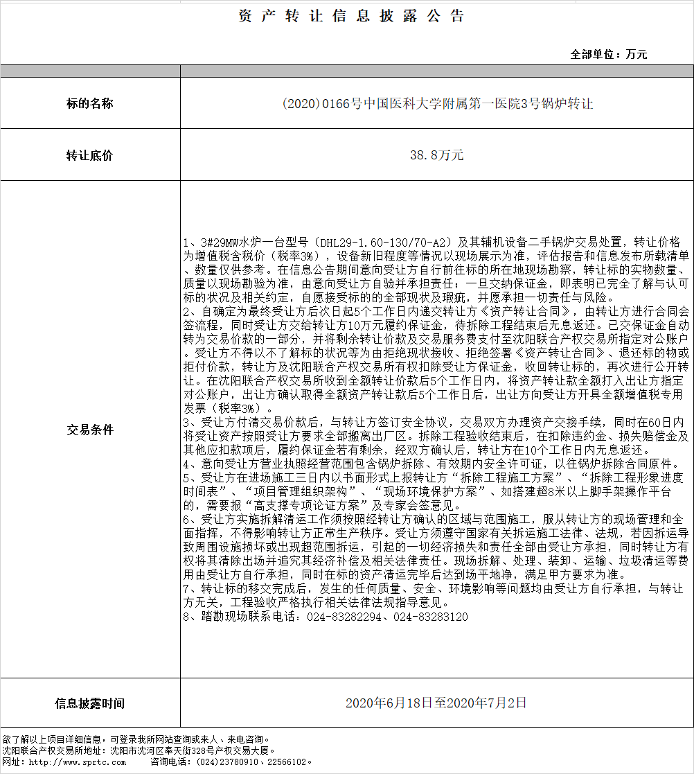 (2020)0166號中國醫(yī)科大學(xué)附屬第一醫(yī)院3號鍋爐轉(zhuǎn)讓
