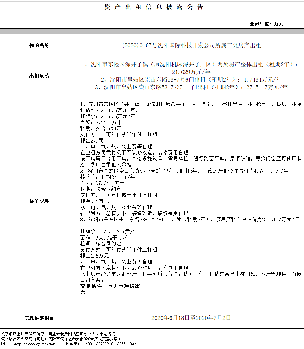(2020)0167號(hào)沈陽國(guó)際科技開發(fā)公司所屬三處房產(chǎn)出租