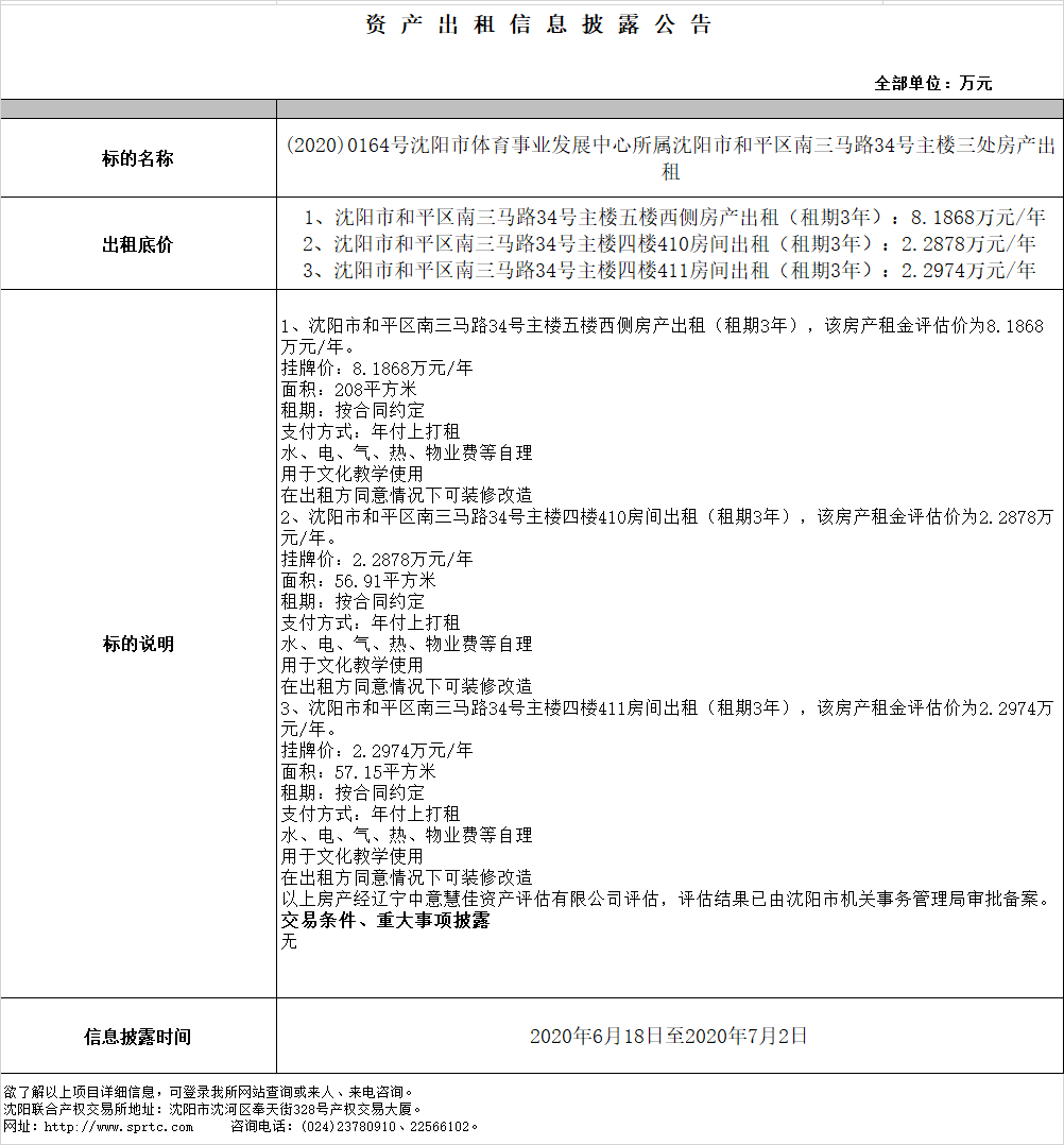 沈陽市體育事業(yè)發(fā)展中心所屬沈陽市和平區(qū)南三馬路34號主樓三處房產(chǎn)出租
