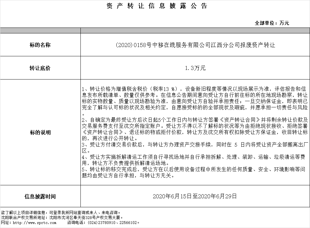 (2020)0158號中移在線服務(wù)有限公司江西分公司報廢資產(chǎn)轉(zhuǎn)讓